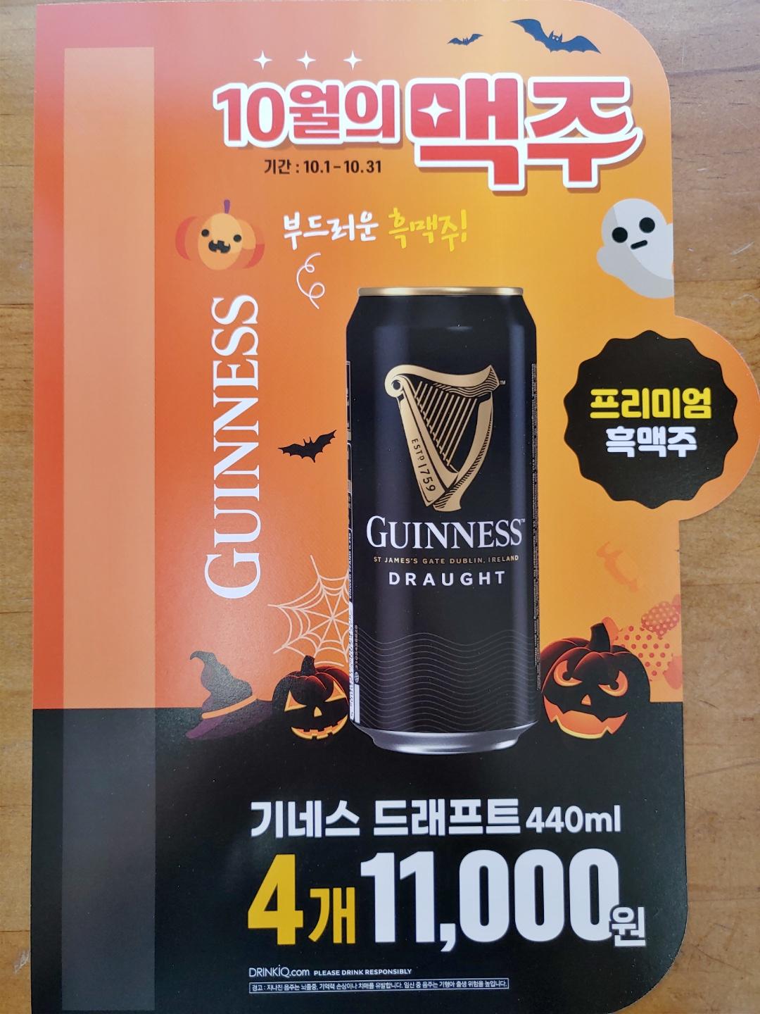 기네스 드래프트 흑맥주 제품이 4캔에 11,000할로윈 행사가 진행된다고 합니다.