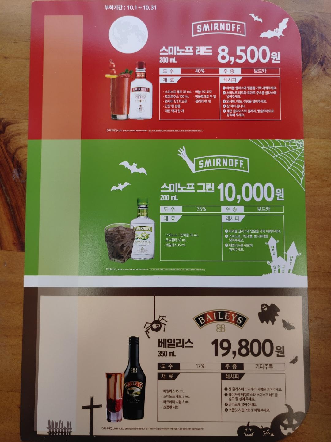 그리고 스미노프레드 , 스미노프 그린애플 , 베일리스도 할로윈 행사로 레시피가 적힌 쇼카드가 있습니다.
