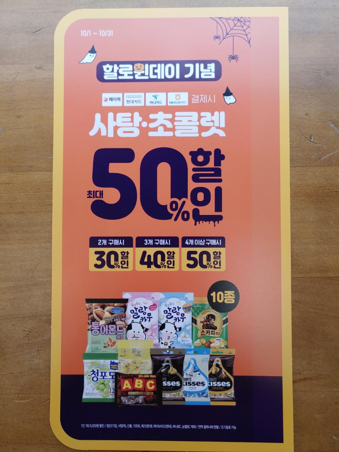 사탕과 초콜렛을 행사카드로 결제시 최대 50%까지 할인이 된다고 하니 이미지를 참고하시면 될 것 같습니다.