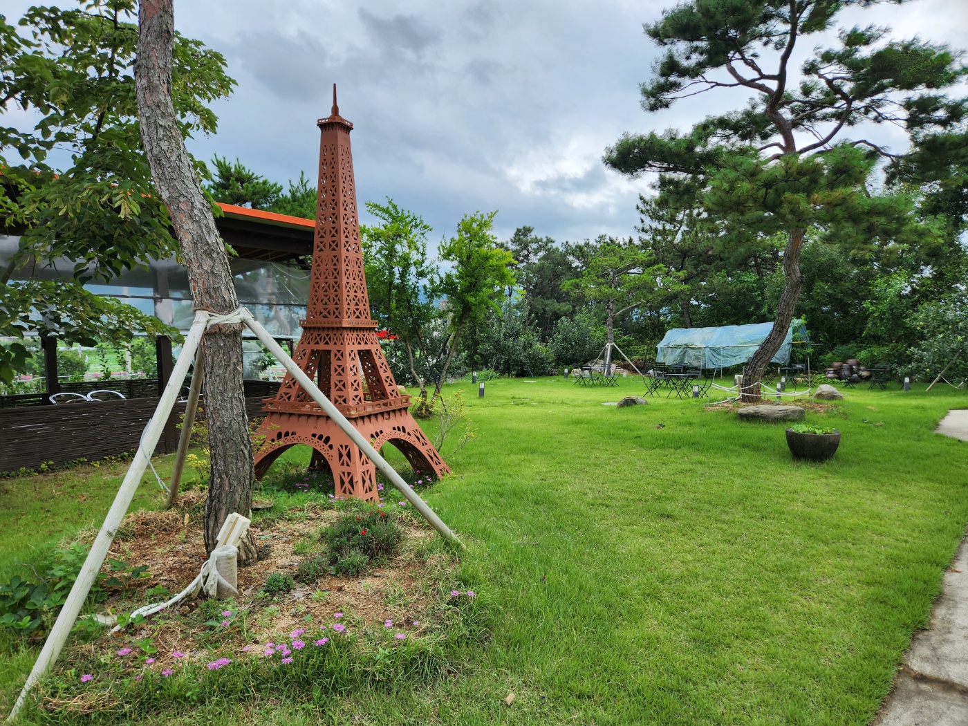 마당에 있는 관리 된 잔디들과 나무 그리고 카페의 위치가 높아서 하늘과 가까운 뷰를 감상하실 수 있습니다.