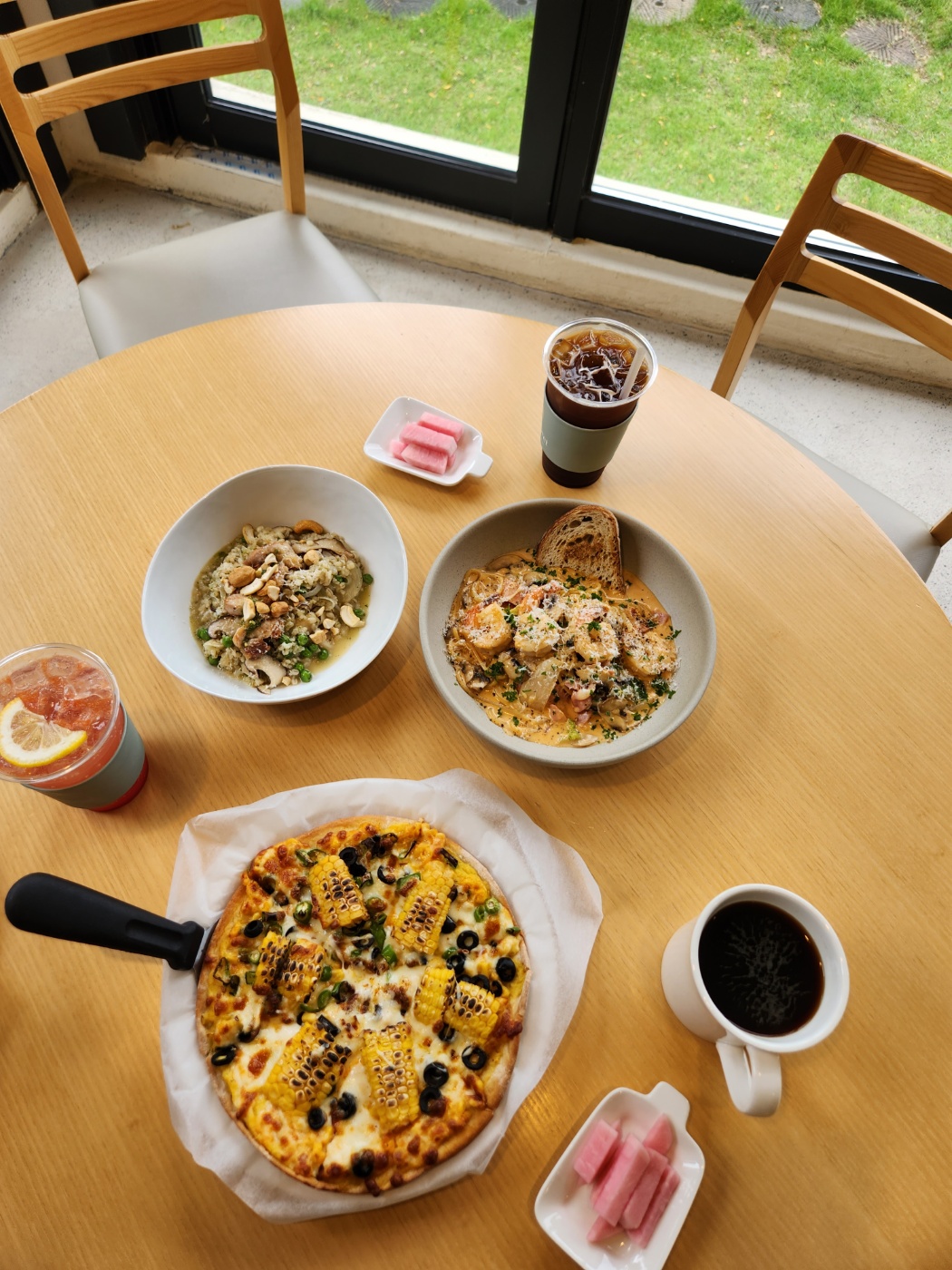 파스타와 옥수수가 들어간 피자 그리고 커피를 주문하였습니다.